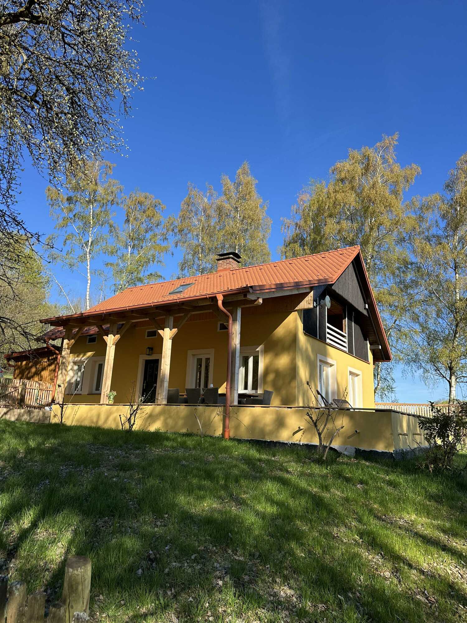 Hrušeň House in Milíře is an ideal choice for those seeking peaceful and comfortable accommodation in the picturesque countryside near Tachov. Spacious living room with an open kitchen, from which you can go through French windows to the terrace. Kitchen unit with hob, oven, kettle, coffee maker, toaster, fridge-freezer and dishwasher. Bathroom with shower, sink and access to the Finnish sauna. Separate toilet with sink. First bedroom with a double bed. Upstairs, the second bedroom with two single beds and one single bed. Third bedroom with a double bed, a single bed, a cot and access to the balcony. Outside, guests have access to a covered terrace with garden furniture and a grill, as well as a large fenced garden with a fire pit and fruit trees. The location of the cottage is ideal for trips to the surrounding forests and meadows, where you can enjoy fresh air and recharge your batteries.